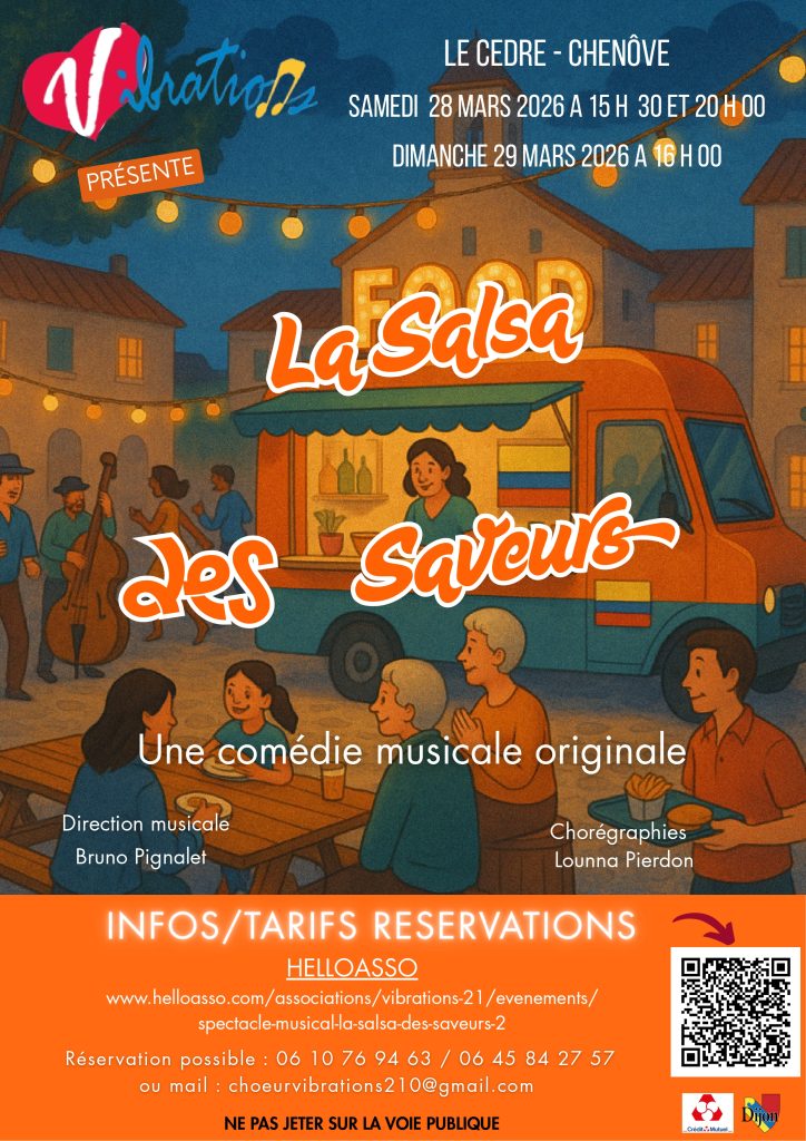 Vibrations vous propose sa dernière création « La Salsa des saveurs » où comment l’arrivée impromptue d’un Food truck sur la place du village va opposer les habitants du quartier. Lisa, pétillante colombienne pleine de ressources pourra-t-elle se faire accepter et convertir les réfractaires à ses spécialités ?